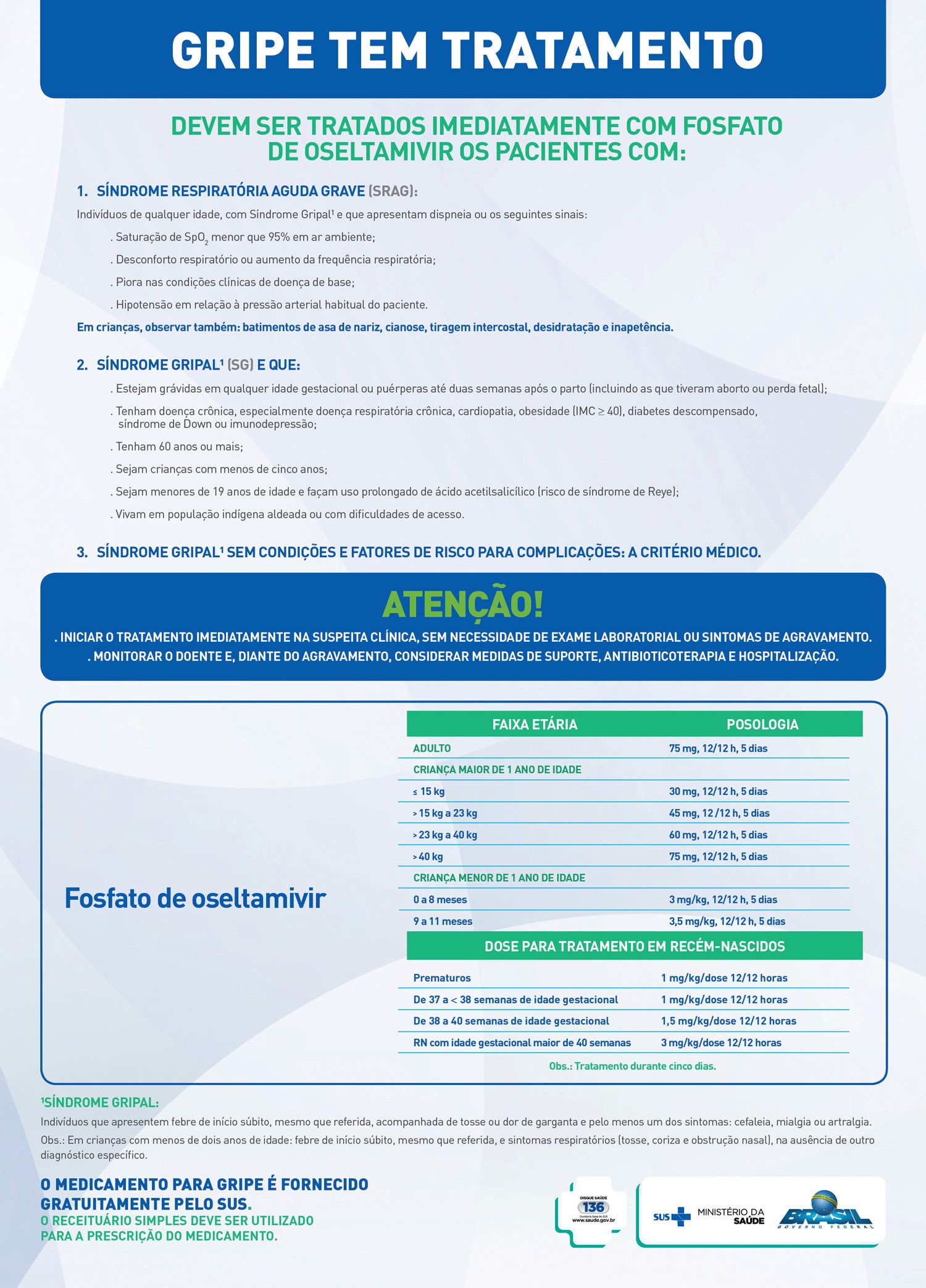 O tratamento é feito com o antiviral (Fosfato de Oseltamivir) para os casos de Síndrome Respiratória Aguda Grave SRAG e para Síndrome Gripal em pessoas com fatores de risco para complicações (clique aqui para ver o protocolo de tratamento), o mais precocemente, preferencialmente nas primeiras 48 horas após o início dos sintomas. O antiviral esta disponível gratuitamente para a rede publica e privada.