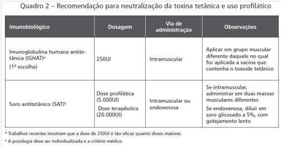 Tratamento Específico: Administração de Soro Antitetânico SAT e/ou Imunoglobulina Antitetânica IGHAT e antibioticoterapia. Ver Guia de Vigilância Epidemiológica 2014, pág.204-207.